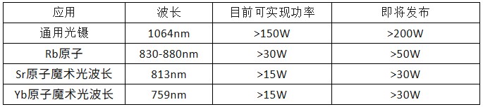 外腔半导体激光器在经过TA放大后,最高功率仅为3-4W,且光斑质量较差,能有效利用的光功率仅为50-60%,显然无法满足前沿科学研究。因此常用的方案是光纤激光器和钛宝石激光器。目前成熟商用的钛宝石激光器在852nm附近的功率仅为8W, 最近几年无明显提升。