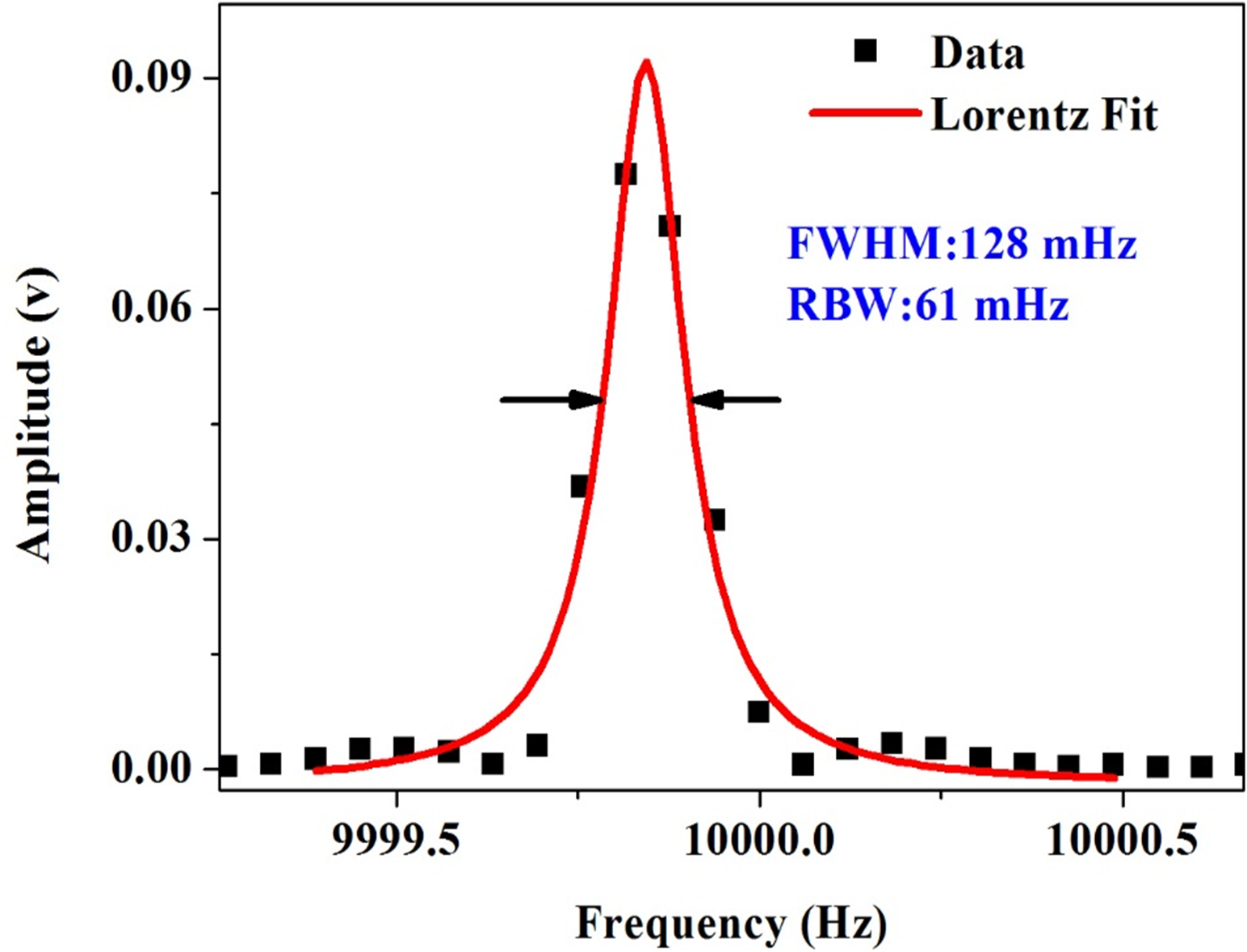 普通的射频频谱仪RBW最小为1Hz,最多只能测量到1 Hz的线宽。为了进一步扩大测量精度,技术人员将测量到的射频信号同另一个频率相近的稳定的射频信号混频到10 kHz左右的音频信号,并使用SR770 FFT分析仪进行测量。在RBW为61 mHz时,测量到的半高全宽为128 mHz,即放大过程的线宽展宽,如下图(2)所示。实际上,这种展宽是非常缓慢地频率波动,并不是快速的展宽,它也可以用频率稳定度来表征。